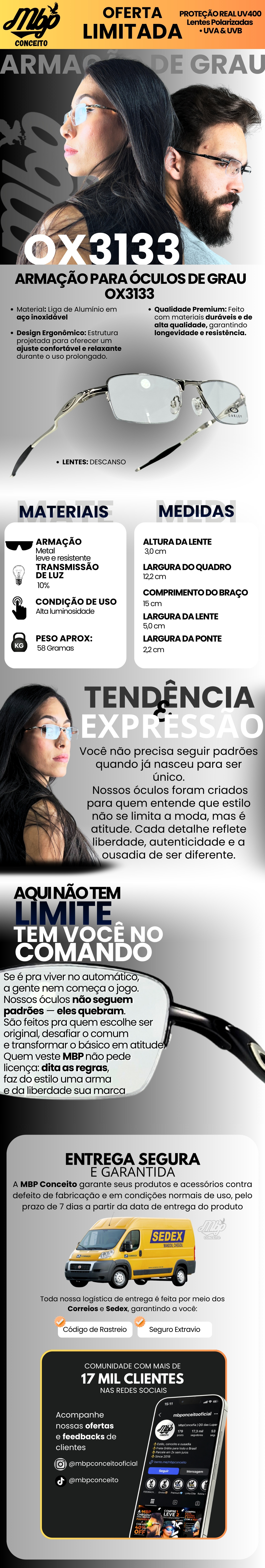 - Trabalhamos com armações em X-Metal e acetato, materiais reconhecidos pela resistência, leveza e excelente desempenho no uso diário, seja para lazer, esportes ou exposição prolongada ao sol.