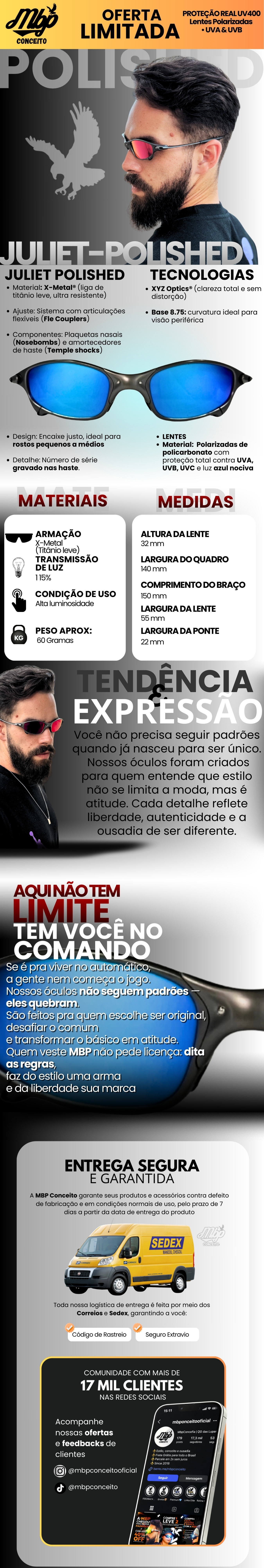 - Todos os pedidos acompanham saquinho exclusivo MBP Conceito™ e flanela de microfibra, garantindo proteção e cuidado com as lentes no mesmo padrão de quem entende de estilo e qualidade.