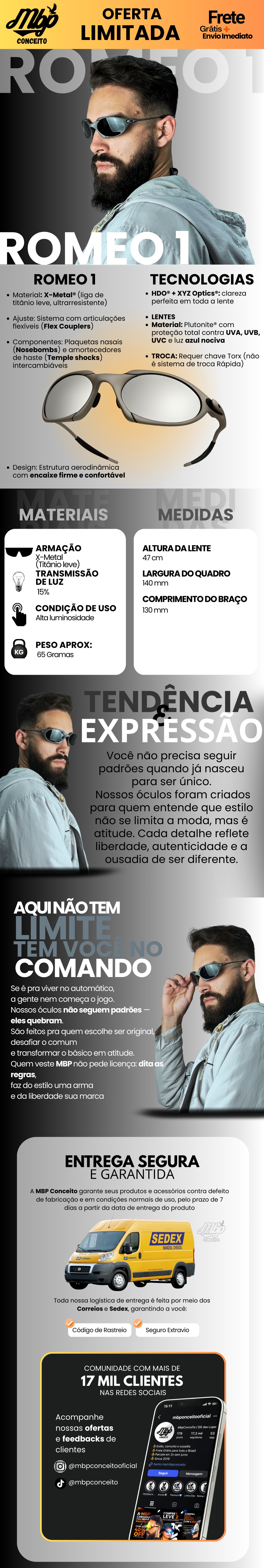 Com certeza! O Romeo 1 faz parte da nossa linha premium MBP Conceito™, reconhecida pela qualidade de acabamento e resistência das armações X-Metal, inspiradas em modelos clássicos de alto desempenho.