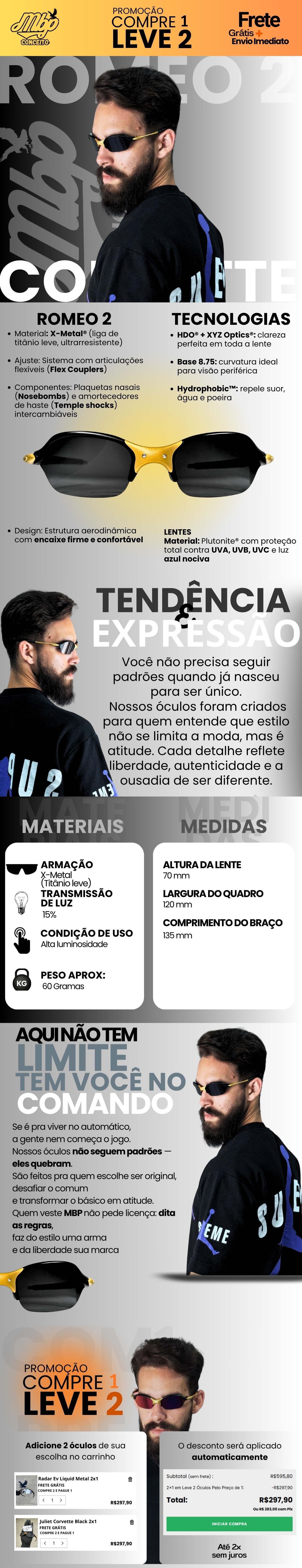 O Óculos Romeo 2 Corvette Black combina resistência, sofisticação e autenticidade com sua estrutura metálica, pinos centrais e numeração nas hastes, oferecendo estilo, conforto e ótimo custo-benefício.
