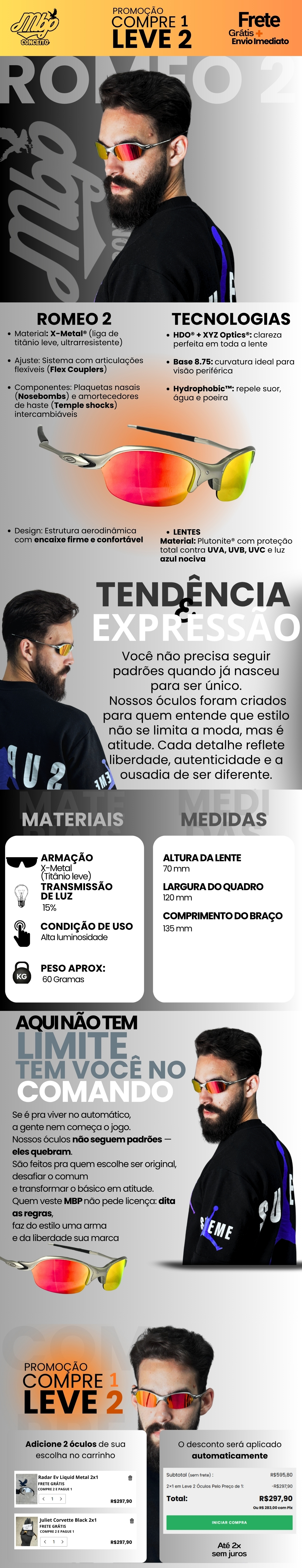 O Óculos Romeo 2 X-Metal Ruby combina resistência, sofisticação e autenticidade com sua estrutura metálica, pinos centrais e numeração nas hastes, oferecendo estilo, conforto e ótimo custo-benefício.