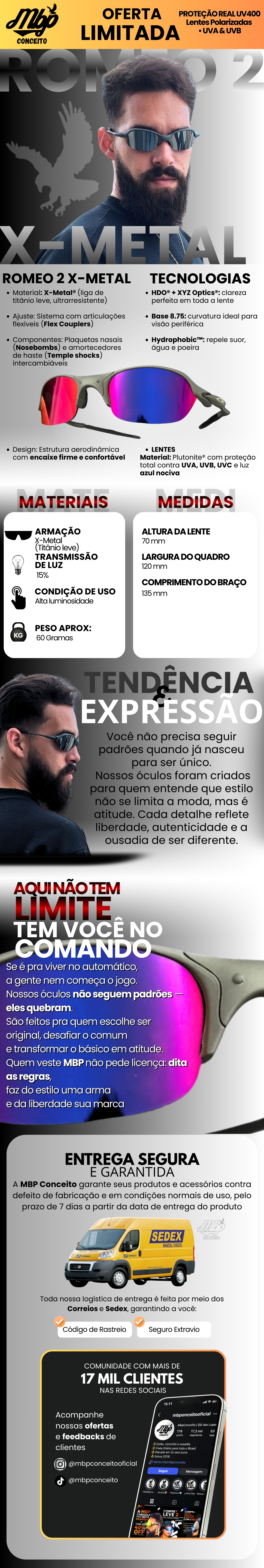 - Trabalhamos com armações em X-Metal e acetato, materiais reconhecidos pela resistência, leveza e excelente desempenho no uso diário, seja para lazer, esportes ou exposição prolongada ao sol.