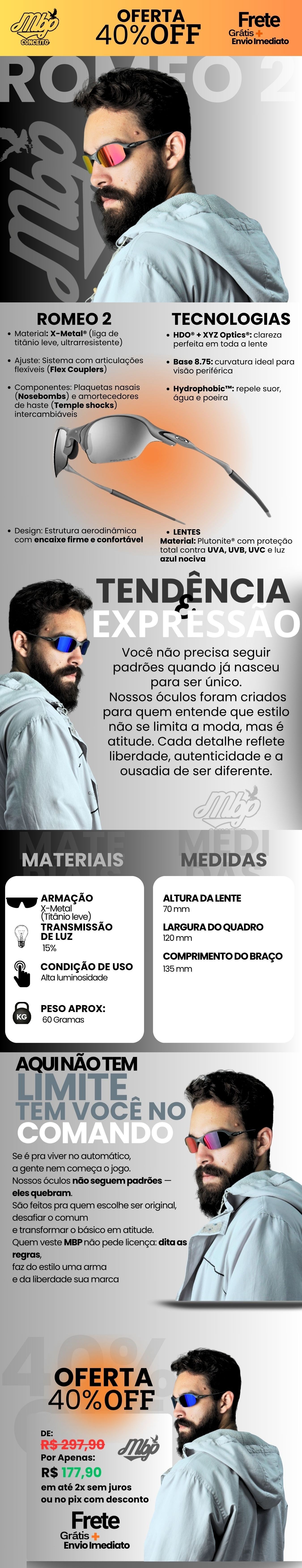 O Óculos Romeo 2 X-Metal combina resistência, sofisticação e autenticidade com sua estrutura metálica, pinos centrais e numeração nas hastes, oferecendo estilo, conforto e ótimo custo-benefício.