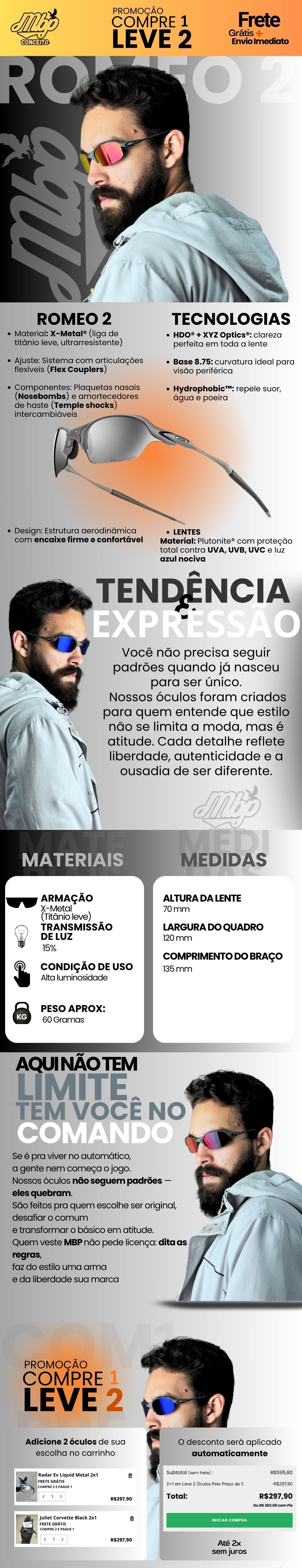 O Óculos Romeo 2 X-Metal combina resistência, sofisticação e autenticidade com sua estrutura metálica, pinos centrais e numeração nas hastes, oferecendo estilo, conforto e ótimo custo-benefício.