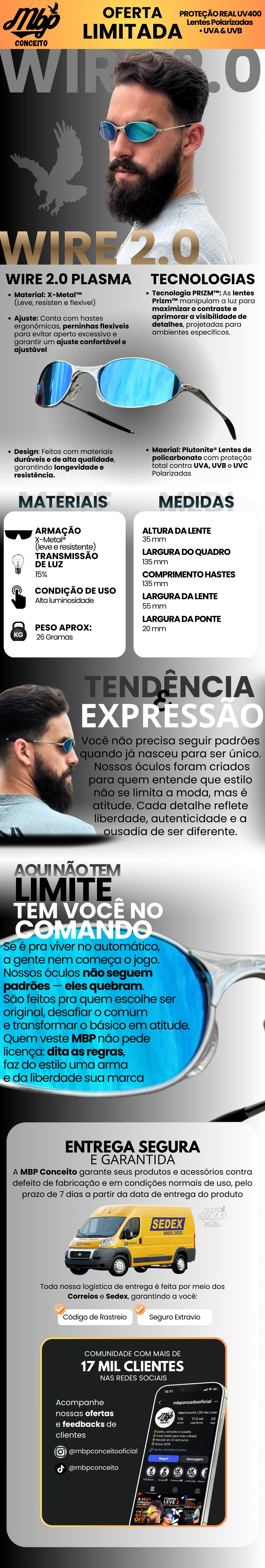 - Todos os pedidos acompanham saquinho exclusivo MBP Conceito™ e flanela de microfibra, garantindo proteção e cuidado com as lentes no mesmo padrão de quem entende de estilo e qualidade.
