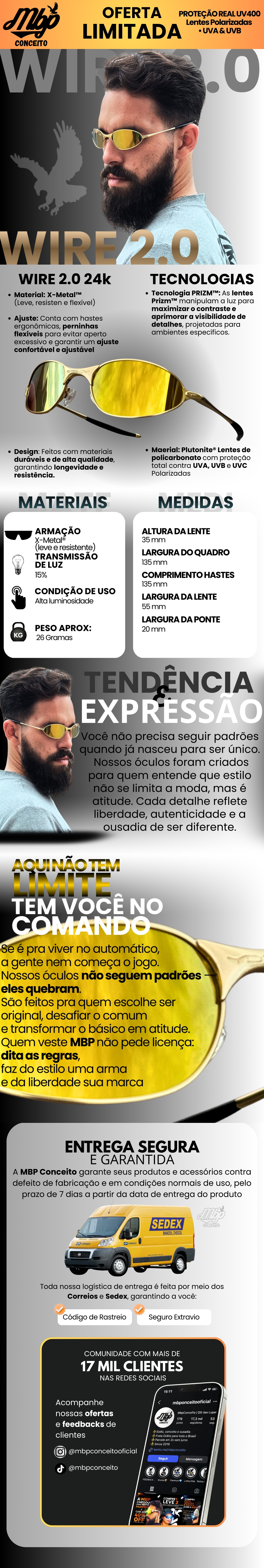 - Todos os pedidos acompanham saquinho exclusivo MBP Conceito™ e flanela de microfibra, garantindo proteção e cuidado com as lentes no mesmo padrão de quem entende de estilo e qualidade.